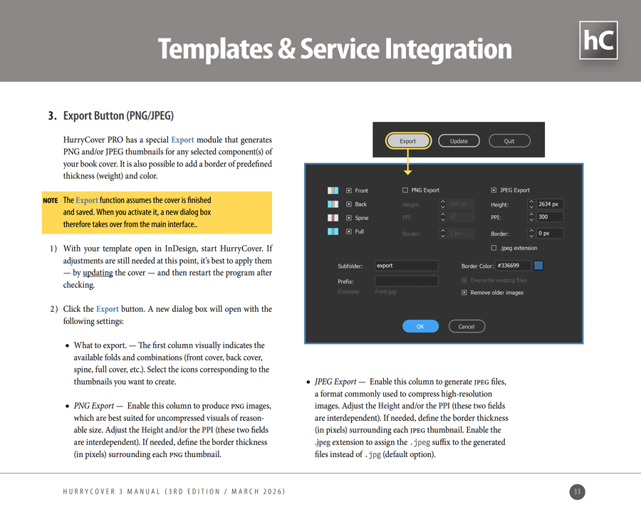 Need quick, high-quality images of your cover parts (front, spine, back, flaps) for promos, client approvals, or digital catalogs? HurryCover PRO lets you export each piece as PNG or JPEG, with fine-tuned control over resolution, size, and border. Fast, sharp, and ready to impress.
