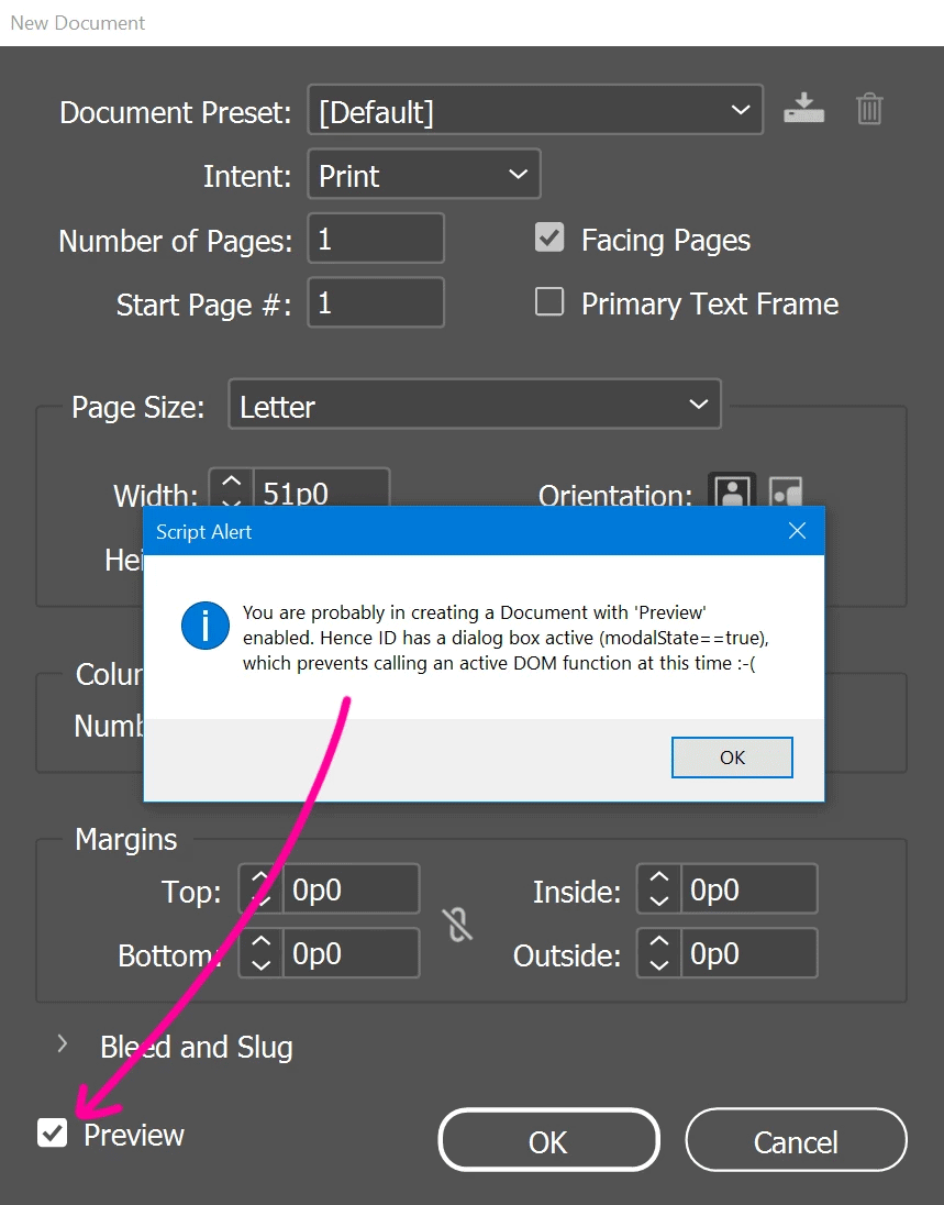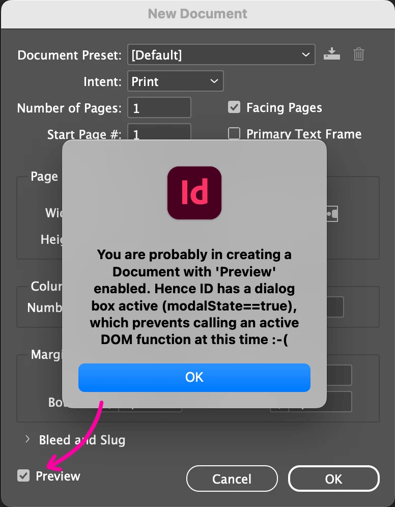 The crucial parameter is app.modalState. As stated in the original error message you encountered, you cannot send an active DOM command while a modal window is open. This is a fundamental rule of the scripting system. Depending on how the New Document dialog is used, the app might be in a “modal state” at the exact moment the document is generated. This particularly occurs when the Preview checkbox is enabled, causing the document to be created in the background (triggering the afterNew event).