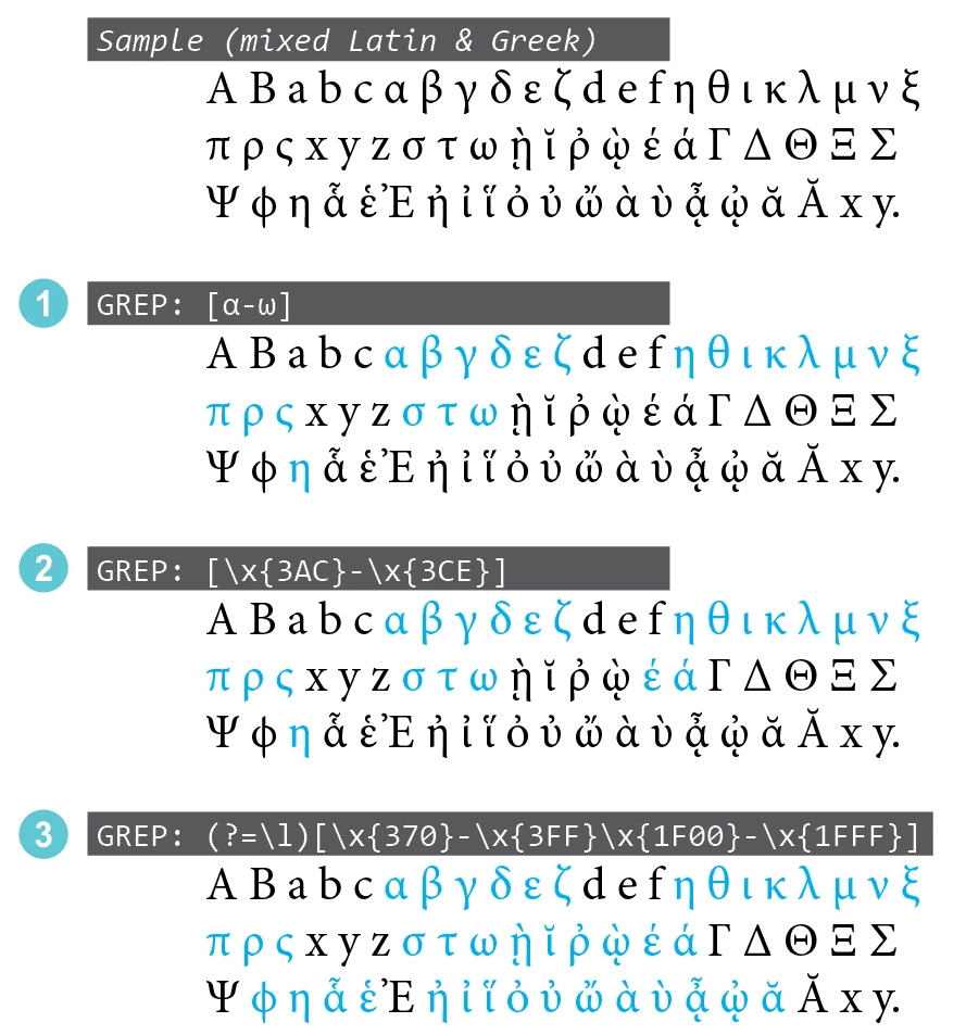 The discussion around this technical issue led to the more general question of capturing characters from the Greek alphabet. Here are some additional ideas regarding InDesign GREP patterns: