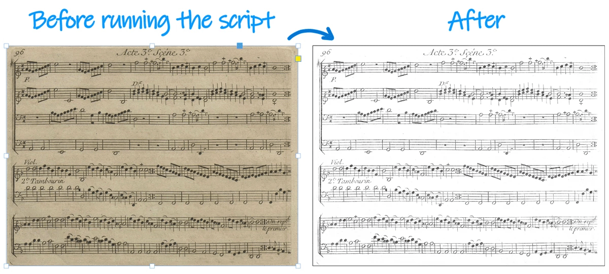 (function( orig, dup,g) //---------------------------------- // Assuming a simple image container is selected on the page. { // 1. Basic enhancer. (orig=app.selection[0]).properties = { strokeColor: "Black", transparencySettings: {blendingSettings:{blendMode:+BlendMode.SCREEN}}, }; with( dup=orig.duplicate() ) { graphics.everyItem().remove(); fillColor = "Black"; sendToBack(); } // 2. Increase the B/W contrast if needed. g = orig.parent.groups.add([orig,dup]); (dup=g.duplicate()).properties = { transparencySettings: {blendingSettings:{blendMode:+BlendMode.COLOR_BURN}}, }; })();
