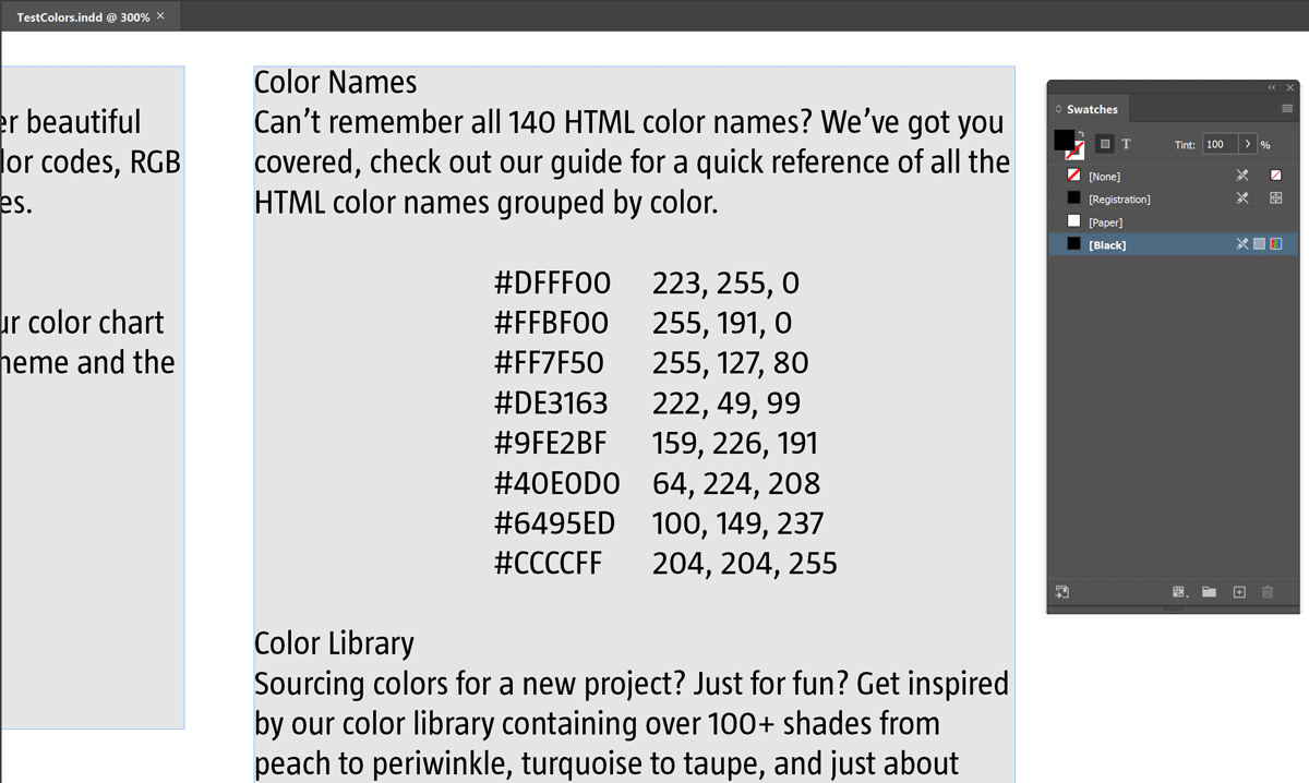 function findReplaceHexColors(/*?str*/ADD_ON, doc,K,pp,a,q,sto,s,m,i,t,x,k,p,z,rgb,color) //---------------------------------- // Detect #RRGGBB or #RGB patterns and add a suffix (ADD_ON arg) with that // fill color applied. // [CHG240113] Leave ADD_ON arg empty (or falsy) to get the colors // applied to the hex codes themselves. // [REM] This function does not explore tables, notes, etc. { // Declare once and for all the regex (`#RGB` or `#RRGGBB` form). const HEX_REG = /#(?:[0-9a-f]{3}){1,2}\b/gi; // [CHG240113] Normalize ADD_ON (1st arg). 'string' == typeof ADD_ON || (ADD_ON=false); // Check ref to active doc. if( !(doc=app.properties.activeDocument) ) return; // Store `doc.colors` collection and presets rgb prop. K = doc.colors; pp = { model: +ColorModel.process, space: +ColorSpace.rgb, colorValue: void 0, // pending name: void 0, // pending }; // Array of Story instances. a = doc.stories.everyItem().getElements(); // Loop through all text units. for( q={} ; sto=a.pop() ; ) { s = sto.texts[0].contents; // s :: str ; tx contents m = s.match(HEX_REG); // m :: str[]|null ; hex matches if( !m ) continue; // No match found // Loop through matches and indices *from the end*. for( x=1/0, i=m.length ; i-- && 0 <= (x=s.lastIndexOf(t=m[i],x)) ; --x ) { // Create a normalized key (k :: `#RRGGBB`) k = t.toUpperCase(); 4===k.length && (k=t.slice(0,2)+t[1]+t[2]+t[2]+t[3]+t[3]); // #RGB -> #RRGGBB // Get or create the corresponding Color (cached!) if( q.hasOwnProperty(k) ) { color = resolve(q[k]); } else { (color=K.itemByName(k)).isValid || ( rgb = parseInt(k.slice(1),16), pp.colorValue = [ 0xFF&(rgb>>>16), 0xFF&(rgb>>>8), 0xFF&(rgb>>>0) ], pp.name = k, q[k]=(color=K.add(pp)).toSpecifier() ); } // [CHG240113] Supports empty ADD_ON. if( !ADD_ON ) { // Colorize the hex code. p = x; z = t.length; } else { // Insert ADD_ON and colorize it. p = x + t.length; sto.insertionPoints[p].contents = ADD_ON; z = ADD_ON.length; } sto.characters.itemByRange(p,p+z-1).fillColor = color; } } } findReplaceHexColors( ); // You can pass in an 'add-on' string, e.g "\t\u2022"