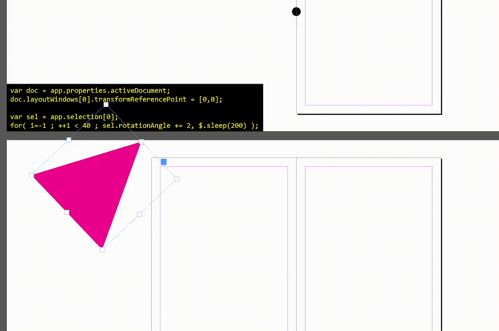 var doc = app.properties.activeDocument; doc.layoutWindows[0].transformReferencePoint = [0,0]; var sel = app.selection[0]; for( i=-1 ; ++i < 40 ; sel.rotationAngle += 2, $.sleep(200) );
