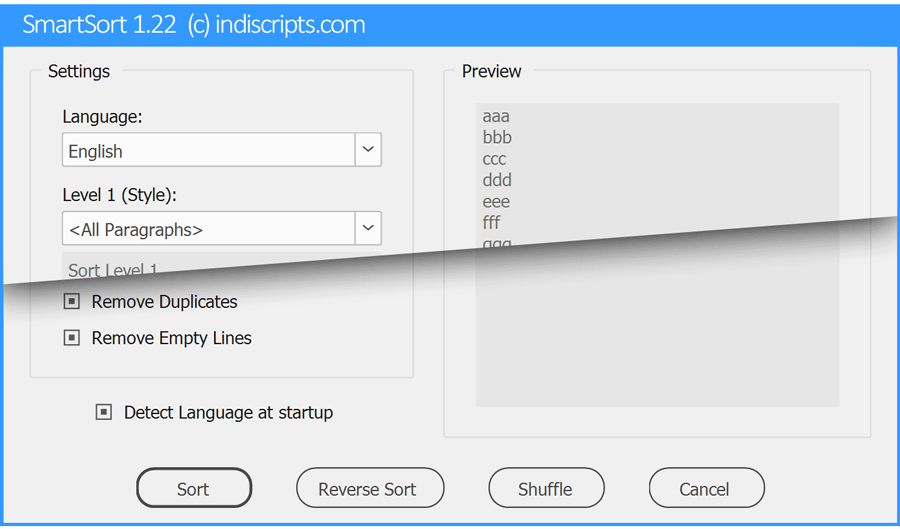 SmartSort is a free InDesign script that sorts paragraphs or cells. It produces a lexicographic order consistent with the language considered. Version 1.21 fixes an issue related to case discrimination in various ‘tailored’ languages. It also deals with the letter ⟨ё⟩ in Russian.