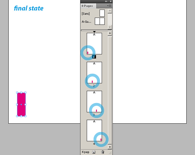 The power of scripting is to convert this kind of exhausting task into a simple click. Sometimes a long development is required, but this time the solution was almost obvious: the user only needs to create and position the object on the first page it shows up (initial position), and to duplicate it to the last place it shows up (final position), on the same page. Then he selects the first and the second page item, and runs the script.