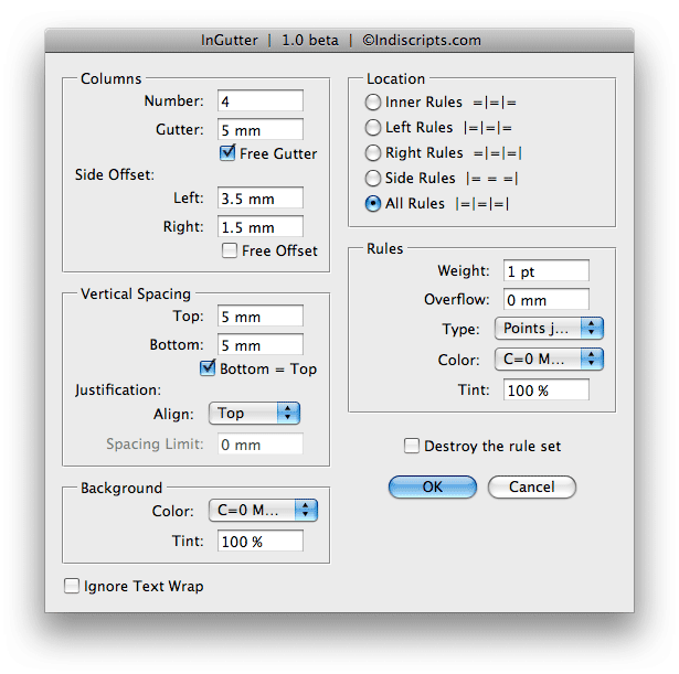 [Update 10/26/09] InGutter 1.04b brings a better user interface. The obscure Free Gutter and Free Offset checkboxes have been removed. Now you can control in a single field the Rule Offset —signed value,— which specifies the moving off centre of the rules within the gutter: