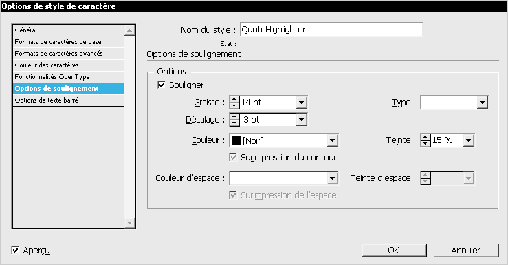 Rappelons rapidement le procédé. On crée d'abord un style de caractère neutre qui se contente d'activer l'attribut soulignement, mais en épaississant, décalant et colorant le trait de telle sorte qu'il produise un léger badigeon :