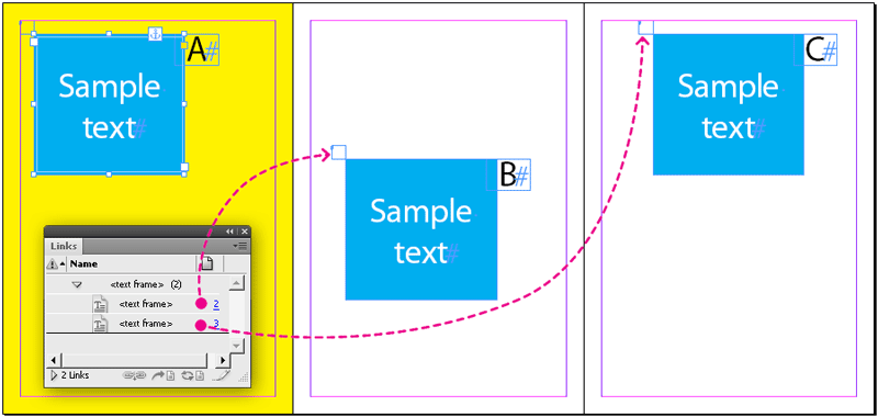 Each instance of the “Sample text” frame is nested in a linked story which simply derives from the original container. The Links panel displays the status of these instances and, of course, if the master object is edited, the out of sync icon appears next to the group of linked stories, so you just need to double-click the icon to update the clones.