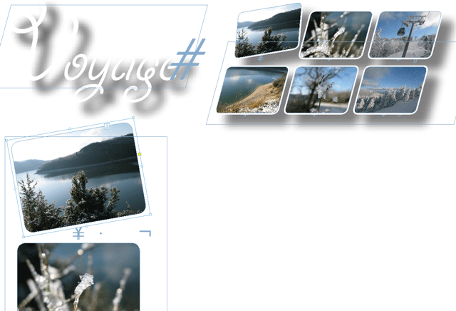 Here is another promising application: you can put in the same root container as many anchors as you need, which allows you to manage a set of objects from one place and to produce their clones in a different arrangement, based on the specific rules applied to each container. In the following layout, a set of six images is purely cloned and arranged in two different ways. The master container—at left—has all images arranged in a single column using a custom baseline (most anchor characters are separated by forced line breaks). Meanwhile, the linked container—top center—displays the same set of pictures in two rows and adds various effects (scaling, skewing, drop shadow, blending mode).