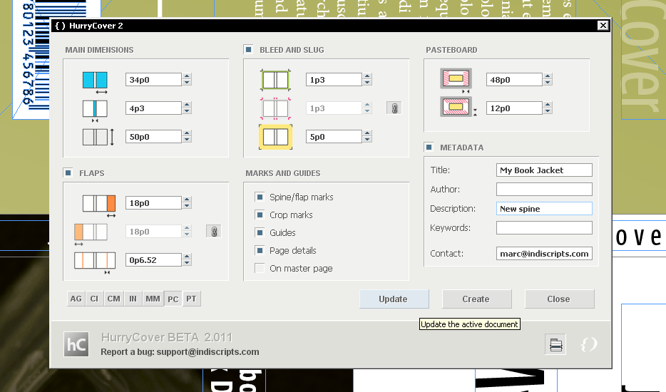 Basically, HurryCover is a book cover builder. You can use it to create hard cover templates, dust jackets or even leaflets. Run the script, type in the desired dimensions and just click Create: