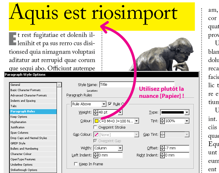 Dans mon exemple, le titre d'article repose sur un paragraphe étendu sur deux colonnes (rubrique Étendue de colonnes). Pourtant InGutter ne dispose d'aucun mécanisme particulier pour gérer cette situation. Il faut donc user d'une petite astuce pour que la zone de titrage ne laisse pas apparaître en transparence le filet de colonne sous-jacent. Dans le style du titre, je crée un épais filet de paragraphe possédant la nuance [Papier]. C'est ainsi que le titre fonctionne comme une région opaque et masque le filet vertical :