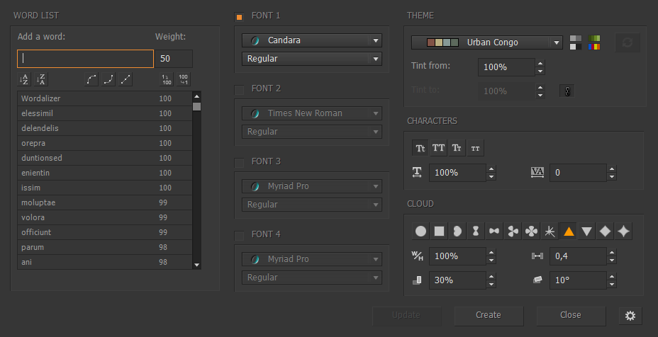 2. You can also provide a prepared word list from an external source (e.g. the clipboard.) The option “Detect word list” must be turned on in the advanced settings. In that case, words and weights must be formatted line-by-line, and duplicates are allowed as well. Here is an example: