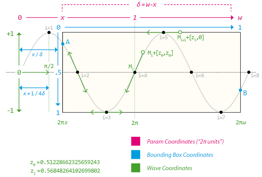 as a canvas and creates a sine wave fitting the target area. This curve is not made of straight-line samples which wouldn't scale smoothly. Instead, we approximate the sine function using a cubic Bézier curve that renders each quarter of the period, 0..π/2