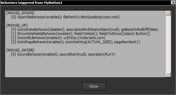// Assuming a Button object is selected // --- var myButton = app.selection[0]; // ================================= // FORMATTING UTILITIES // ================================= var formatBehaviorCode = function F(/*Behavior*/o, a,k) // --- // Extract human-friendly 'code' from a Behavior of any kind { F.SKIP||(F.SKIP={name:1,behaviorEvent:1,id:1,label:1,parent:1,index:1,/*add disregarded properties*/}); k = o.__class__; o = o.properties; a = [localize("%1(%2)",k,o.enableBehavior?"enabled":"disabled")]; delete o.enableBehavior; for( k in o ) { if( !o.hasOwnProperty(k) || F.SKIP[k] ) continue; a.push(localize("%1(%2)",k,o[k])); } return a.join('; '); }; var formatResults = function F(/*any*/o,/*?uint*/indent, z,s,a,k) // --- // Format the results { if( 'object' != typeof o ) return ''+o; // Build the format string // --- s = ''; z = (indent||(indent=0)); while( z-- ) s+=' '; s += "[%1]" + (indent?' ':'\r') + "%2"; // Explore the keys // --- a = []; z = 0; for( k in o ) { if( !o.hasOwnProperty(k) ) continue; a[z++] = localize( s, k, F(o[k],1+indent) ); } // Join // --- return a.join(indent ? '\r' : '\r\r'); }; // ================================= // MAIN PROCESS // ================================= var a = myButton.behaviors.everyItem().getElements(), r = {}, s, t, w, u; // Compute // --- while( t=a.shift() ) { s = t.behaviorEvent.toString(); (r[s]||(r[s]=[])).push(formatBehaviorCode(t)); } // Display // --- (w=new Window('dialog',"Behaviors triggered from "+myButton.name)) .add('edittext',u,formatResults(r),{multiline:true}).parent .add('button',u,"Close",{name:'OK'}).parent; w.children[0].minimumSize = [600,250]; w.show();