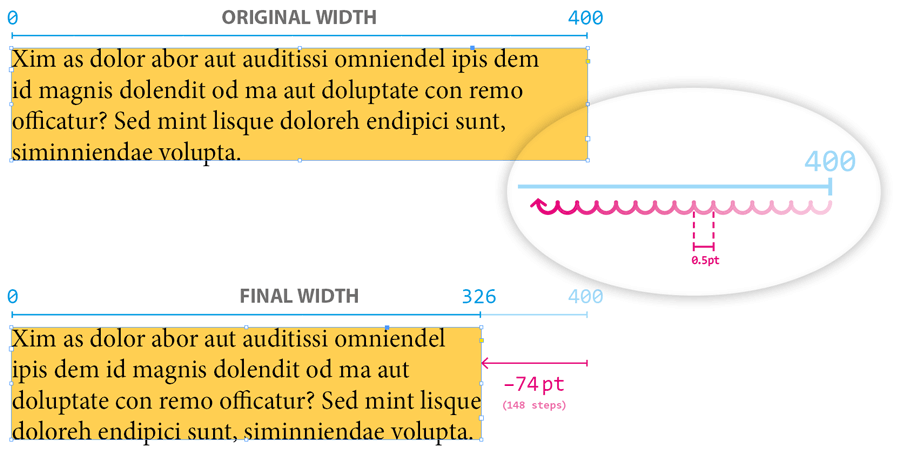 In the above example 148 steps are needed to reach the optimal width. Note that at least two InDesign DOM commands are sent at each step: the first for changing the frame width (i.e. its geometricBounds