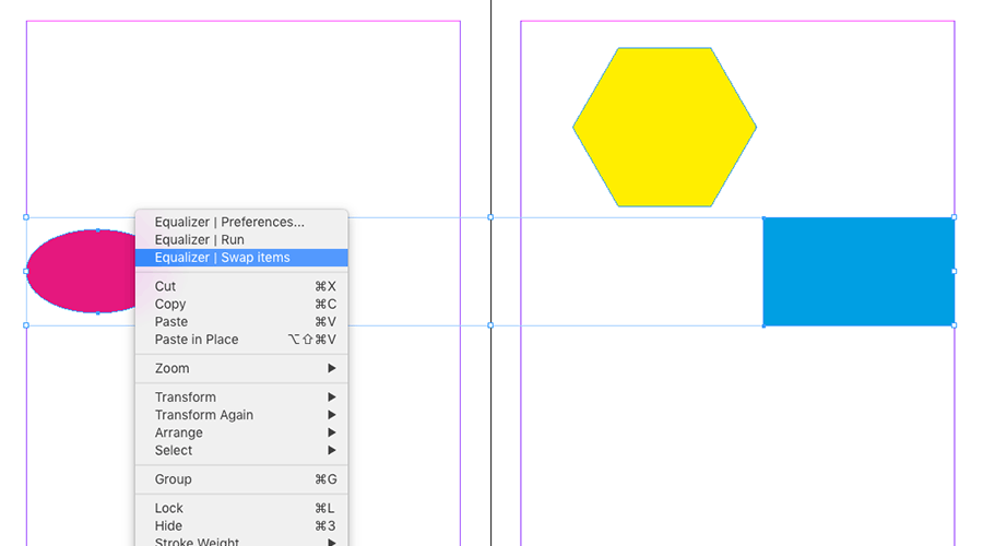 Here we go! Select two page items in your layout, right-click and run Swap items from the context menu. Positions are swapped with respect to the reference point specified in Equalizer's main dialog. For example, if the center anchor is in use, objects A and B will exchange their center point while keeping their respective dimensions. Thus, Swap items only affects locations and disregard any other task that might be defined in Equalizer.