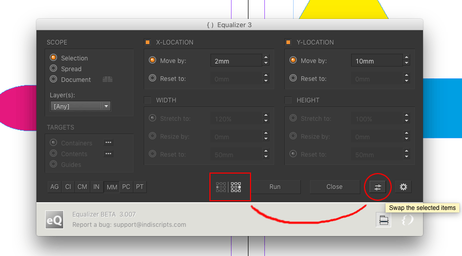 The same functionality can be triggered from Equalizer, assuming that two objects are selected in InDesign. The Swap button (see the screenshot) operates exactly as from the context menu, but this way you can check and/or adjust the reference point before processing (useful when you have no longer in mind your very last settings!)