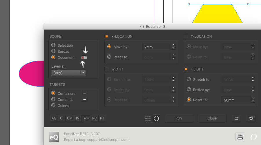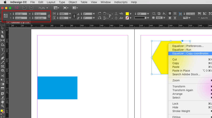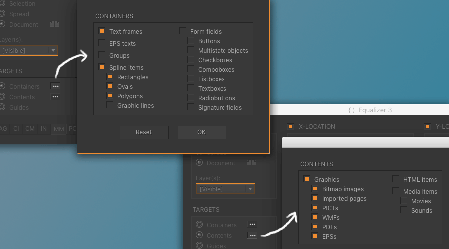 Before processing items through Equalizer, you may need to use a specific object as a “template” in terms of size and/or location. Say for example that some rectangle in your layout has the desired size and the correct X-location for the changes you want to apply to your targets. You could of course manually enter those values in Equalizer, but quicker is to select the rectangle in InDesign, then right-click and choose Equalizer | Copy coordinates. Doing so allows to selectively copy the relevant parameters into Equalizer. By “selectively” I mean that only the Reset to fields which are currently enabled in Equalizer will be updated during the copy. In my example those would be X-LOCATION, WIDTH and HEIGHT.