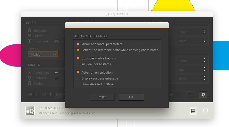 In addition to the previous feature, you can tell Equalizer to always fit its own reference point with InDesign's current reference point while copying coordinates. To turn this option on, go into the Advanced Settings panel and click the checkbox labeled Reflect the reference point while copying coordinates.