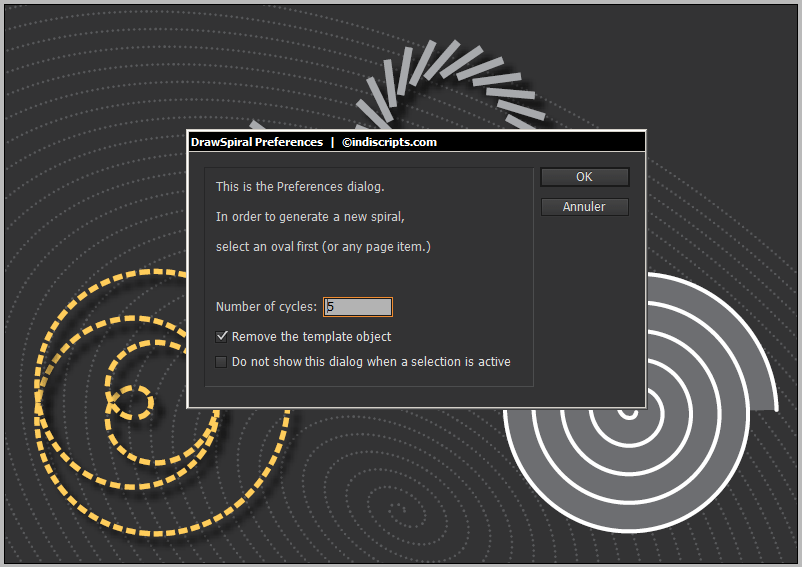 or any frame used as a template. As shown in the demo below, DrawSpiral offers a simple dialog where you can specify the number of desired cycles.