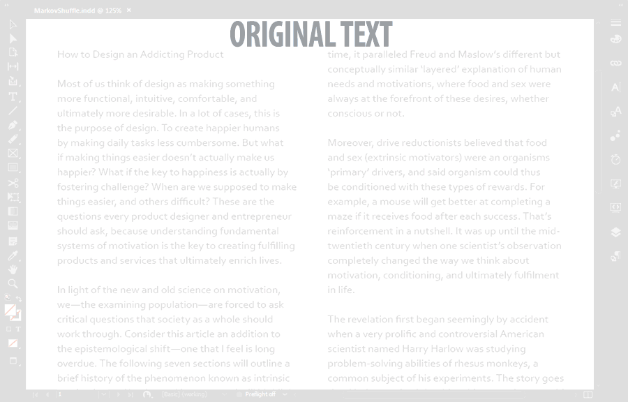 in an array of characters, then it randomly exchanges every character with another one. For the purposes of my experiment I use an excerpt from the story “How to Design an Addicting Product” by Jeff Davidson. Here is the typical outcome of running our naive script (click the image to see the animation):