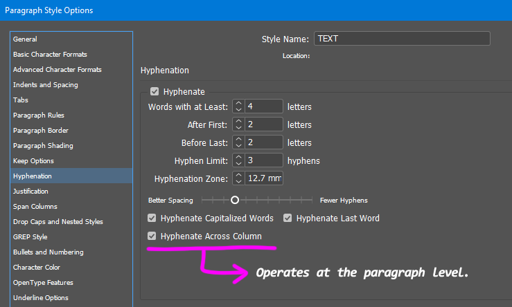 Line breaking and hyphenation sound like similar features but there aren't equivalent. Consider the boolean attribute “Hyphenate Across Column”. It is available in the Paragraph Style Options—this is a paragraph-scoped setting—and it specifically allows or disallows to hyphenate a word across two columns of text.