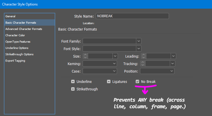 On many occasions, these two levels of adjustment can create a conflict of priorities. What if the user want to disallow column breaks (and column breaks only) from within a particular character style? The “No Break” attribute is too harsh, and “Hyphenate Across Column” only controls hyphenation (word breaking) at the paragraph level!