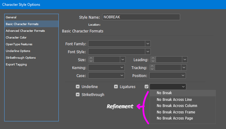 Note. — The option “No hyphenation” (i.e. “No Word Break”) could be added in that list as well. On this topic, see also Add “no hyphenation” as a character style.