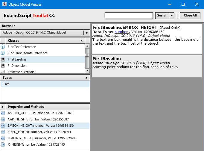 // Assuming a text frame is selected. var tf = app.selection[0]; const EMBOX = FirstBaseline.EMBOX_HEIGHT; tf.textFramePreferences.firstBaselineOffset = EMBOX;